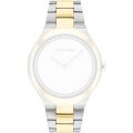 Dit Calvin Klein horlogebandje is gemaakt van roestvrij staal en wordt aan het horloge bevestigd door middel van bandpennen. De band heeft een breedte van 8.5 mm en wordt gesloten door middel van een vouwsluiting met drukknoppen. De band heeft geen rechte aanzet wat betekent dat deze band alleen geschikt is voor de horloges die hieronder worden vermeld.