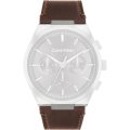 Dit Calvin Klein horlogebandje is gemaakt van leer en wordt aan het horloge bevestigd door middel van stalen pennen. De band heeft een breedte van 26 mm en wordt gesloten door middel van een gesp. De band heeft geen rechte aanzet wat betekent dat deze band alleen geschikt is voor de horloges die hieronder worden vermeld.