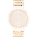 Dit Calvin Klein horlogebandje is gemaakt van roestvrij staal en wordt aan het horloge bevestigd door middel van bandpennen. De band heeft een breedte van 19 mm en wordt gesloten door middel van een vouwsluiting met drukknoppen. De band heeft geen rechte aanzet wat betekent dat deze band alleen geschikt is voor de horloges die hieronder worden vermeld.