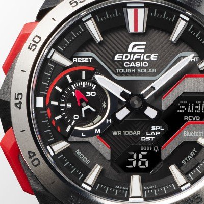 Dit Casio Edifice horloge heeft een kast gemaakt van Met carbon versterkt kunststof met een diameter van 47.6 mm en is voorzien van een Kunststof band. In de kast bevindt zich een Casio kwaliteitsuurwerk en is afgewerkt met Mineraalglas.