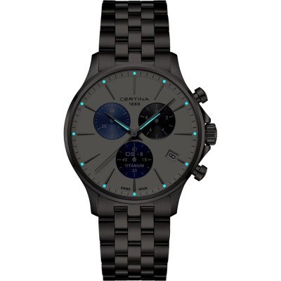 Dit Certina horloge heeft een kast gemaakt van Titanium met een diameter van 41 mm en is voorzien van een Titanium band. In de kast bevindt zich een ETA kwaliteitsuurwerk en is afgewerkt met Enkelvoudig ontspiegeld saffierglasglas.