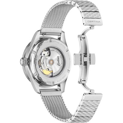 Dit Certina horloge heeft een kast gemaakt van Roestvrijstaal met een diameter van 39 mm en is voorzien van een Roestvrijstaal band. In de kast bevindt zich een ETA kwaliteitsuurwerk en is afgewerkt met Saffierglas.