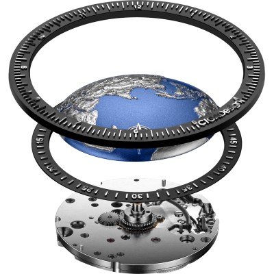 De Ciga Design U Series Blue Planet Automatic U031-TU04-W6U is een werkelijk uniek horloge dat een buitengewoon design combineert met geavanceerde technologie. De Blue Planet Collection staat bekend om zijn unieke interpretatie van tijd en milieusymboliek. Deze collectie heeft lovende kritieken ontvangen, met name het winnen van de Challenge Watch Prize op de 2021 GPHG. De reliëf-wijzerplaat van het horloge bootst de rotatie van de aarde na en staat voor de zorg voor onze blauwe planeet. Het horloge wordt aangedreven door een zelfontworpen automatisch uurwerk dat is ontwikkeld in samenwerking met Seagull. Dit uurwerk maakt gebruik van een unieke overbrengingsverhouding, waardoor de uurwijzer, die de wereldbol zelf is, 30° draait terwijl de minutenwijzer 390° draait. Deze niet-synchrone functie, geïnspireerd op oude zonnewijzers, herdefinieert de tijdmeting door een statische 12-uurschaal te combineren met een roterende minutenwijzer. Het zeemanssymbool - of kompasroos - fungeert als een enkele wijzer terwijl de minutenschijf meedraait met de verstreken tijd. Dit werkelijk buitengewone horloge wordt geleverd in een prachtig presentatieboek dat naast het horloge ook de bijpassende blauwe band en alle documentatie bevat.