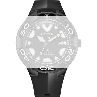 Dit Citizen horlogebandje is gemaakt van siliconen en wordt aan het horloge bevestigd door middel van bandpennen. De band heeft een breedte van 25 mm en wordt gesloten door middel van een gesp. De band heeft geen rechte aanzet wat betekent dat deze band alleen geschikt is voor de horloges die hieronder worden vermeld.
