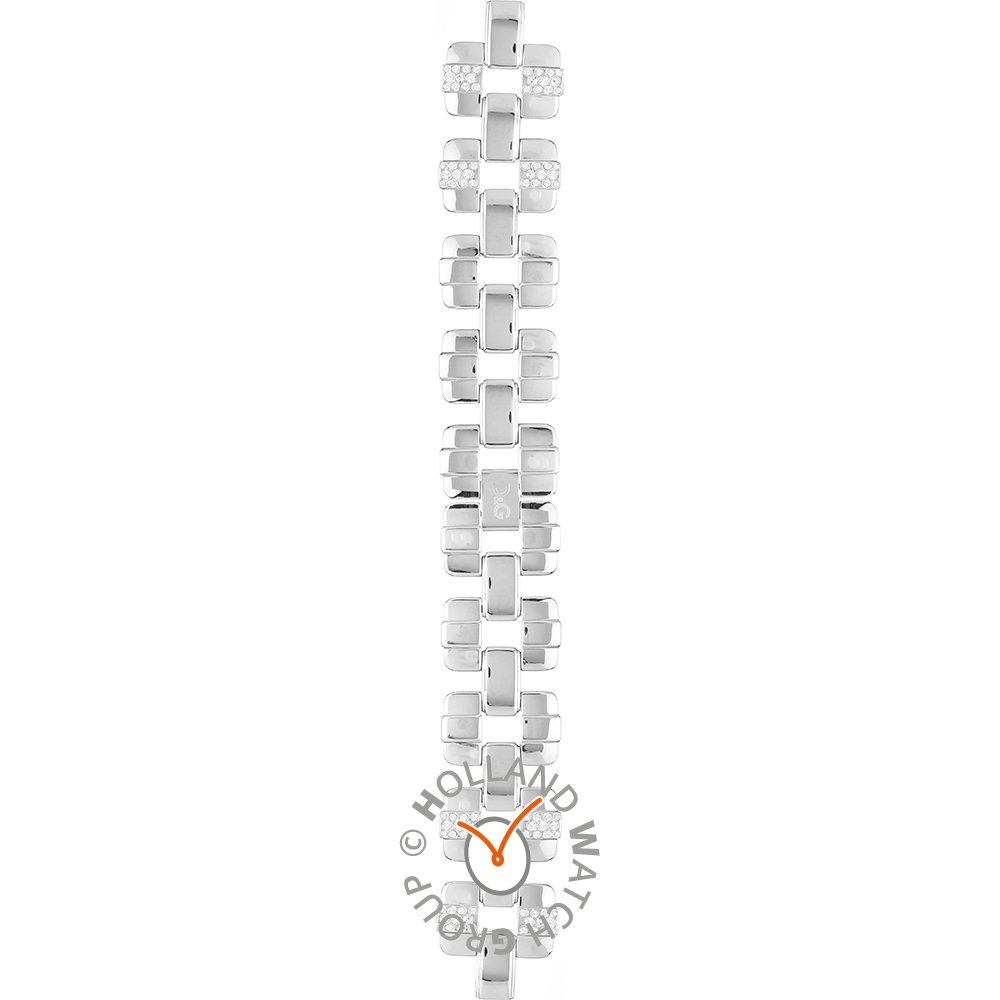 Dit D & G horlogebandje is gemaakt van roestvrij staal en wordt aan het horloge bevestigd door middel van stalen pennen. De band heeft een breedte van 23 mm en wordt gesloten door middel van een sieraadsluiting. De band heeft geen rechte aanzet wat betekent dat deze band alleen geschikt is voor de horloges die hieronder worden vermeld.