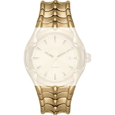 Dit Diesel horlogebandje is gemaakt van roestvrij staal en wordt aan het horloge bevestigd door middel van stalen pennen. De band heeft een breedte van 25 mm en wordt gesloten door middel van een vouwsluiting met drukknoppen. De band heeft geen rechte aanzet wat betekent dat deze band alleen geschikt is voor de horloges die hieronder worden vermeld.