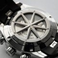 De Grand Ocean horlogeserie is trouw aan de watersport-achtergrond met een indrukwekkende 30 ATM waterdichtheid, een automatisch chronograaf uurwerk en inwendige bezel met tachymeter schaal. Een ander opvallend kenmerk is de kompasroos op de achterkant van de kast met vensters naar het uurwerk. De comfortabele rubberen band met vlindersluiting past precies aan de kast met drie kastpoten. Dit is een opvallend ontwerp dat is geïnspireerd op nautische techniek en zorgt voor een veilige en ergonomische pasvorm terwijl het ook een opvallende look geeft.
