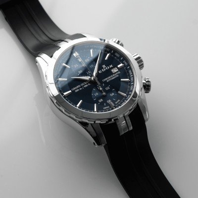 De Grand Ocean horlogeserie is trouw aan de watersport-achtergrond met een indrukwekkende 30 ATM waterdichtheid, een automatisch chronograaf uurwerk en inwendige bezel met tachymeter schaal. Een ander opvallend kenmerk is de kompasroos op de achterkant van de kast met vensters naar het uurwerk. De comfortabele rubberen band met vlindersluiting past precies aan de kast met drie kastpoten. Dit is een opvallend ontwerp dat is geïnspireerd op nautische techniek en zorgt voor een veilige en ergonomische pasvorm terwijl het ook een opvallende look geeft.