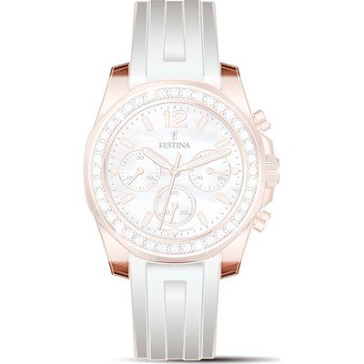 Dit Festina horlogebandje is gemaakt van siliconen en wordt aan het horloge bevestigd door middel van quick release pushpins. De band heeft een breedte van 19 mm en wordt gesloten door middel van een gesp. De band heeft geen rechte aanzet wat betekent dat deze band alleen geschikt is voor de horloges die hieronder worden vermeld.