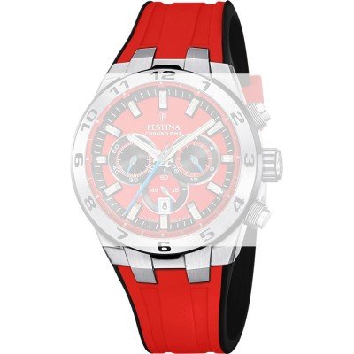 Dit Festina horlogebandje is gemaakt van siliconen en wordt aan het horloge bevestigd door middel van stalen pennen. De band heeft een breedte van 28 mm en wordt gesloten door middel van een gesp. De band heeft geen rechte aanzet wat betekent dat deze band alleen geschikt is voor de horloges die hieronder worden vermeld.