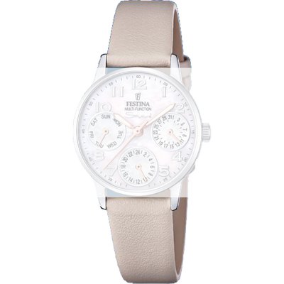 Dit Festina horlogebandje is gemaakt van leer en wordt aan het horloge bevestigd door middel van bandpennen. De band heeft een breedte van 15 mm en wordt gesloten door middel van een gesp. De band heeft een rechte aanzet wat betekent dat deze band geschikt is voor alle Festina horloges met een rechte aanzet.