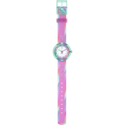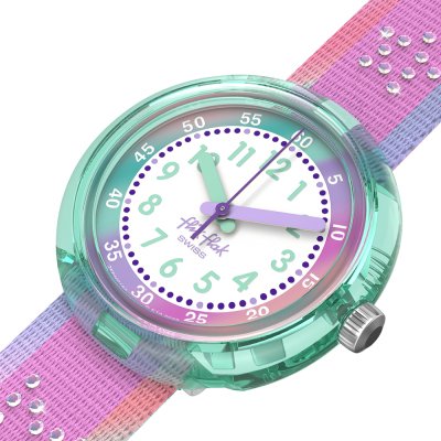 Dit Flik Flak horloge heeft een kast gemaakt van Bio-plastic met een diameter van 30 mm en is voorzien van een textiel band. In de kast bevindt zich een ETA kwaliteitsuurwerk en is afgewerkt met Acrylglas.