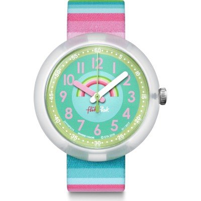 Dit Flik Flak horloge heeft een kast gemaakt van Kunststof met een diameter van 30 mm en is voorzien van een textiel band. In de kast bevindt zich een ETA kwaliteitsuurwerk en is afgewerkt met Acrylglas.