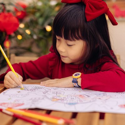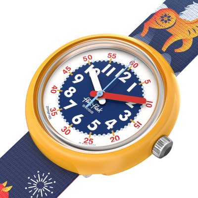Dit Flik Flak horloge heeft een kast gemaakt van Bio-plastic met een diameter van 30 mm en is voorzien van een textiel band. In de kast bevindt zich een ETA kwaliteitsuurwerk en is afgewerkt met Acrylglas.