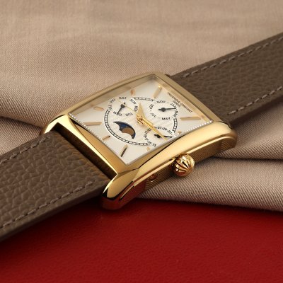 Het Frederique Constant Carrée maanfase horloge is een verfijnd en uitzonderlijk uurwerk met meerdere functies. Het FC-265 quartz uurwerk toont uren, minuten, seconden, maar ook de datum, dag, maand en maanfase, met een indrukwekkende batterijlevensduur van 60 maanden. Dit alles is gevat in een rechthoekige kast van 42,30 x 30 mm, gemaakt van gepolijst, geelgoud verguld roestvrijstaal. De zilverkleurige wijzerplaat met sunburst-afwerking en een reliëfpatroon in het midden, contrasteert met de goudkleurige indexen en wijzers, voor een perfecte afleesbaarheid.