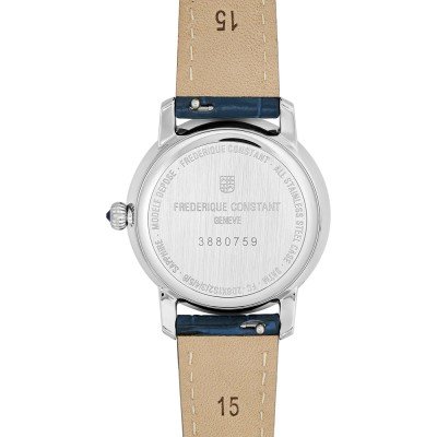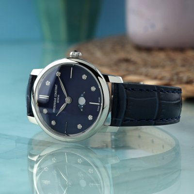 Het Frederique Constant Classics Slimline Ladies Moonphase horloge is een nauwkeurig quartz horloge dat klassieke vrouwelijke stijl combineert met alledaagse functionaliteit. De verfijnde maanfase complicatie is perfect gepositioneerd op 6 uur in de goed uitgebalanceerde en zeer leesbare wijzerplaat met acht echte diamanten uur indexen, die subtiel spelen met de donkerblauwe parelmoer achtergrond. De kast van 30 mm bevat een Ronda 706.4 quartz uurwerk met een batterijlevensduur tot 60 maanden. Het is een verfijnd, luxe horloge voor de vrouw die tijdloze elegantie waardeert.