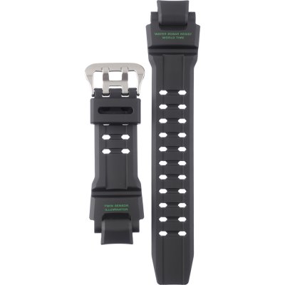 Dit G-Shock horlogebandje is gemaakt van kunststof en wordt aan het horloge bevestigd door middel van bandpennen. De band heeft een breedte van 26.5 mm en wordt gesloten door middel van een gesp. De band heeft geen rechte aanzet wat betekent dat deze band alleen geschikt is voor de horloges die hieronder worden vermeld.