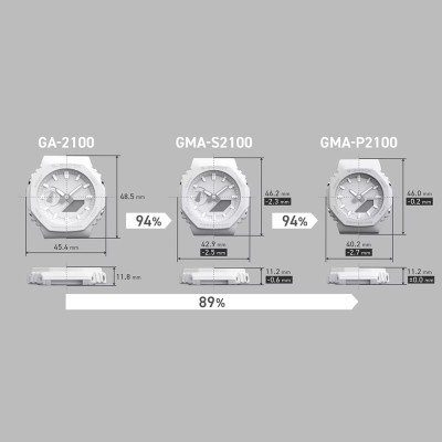 De minimalistische en compacte GMA-P2100-horloges voegen zich bij de GA-2100 en GMA-S2100 in de 2100-lijn van achthoekige horloges. De GMA-P2100-horloges hebben een minimalistisch ontwerp zonder de verzonken wijzerplaat die de andere varianten hadden, waarbij gebruik wordt gemaakt van monochrome afwerkingen in levendige kleuren. Individuele componenten zijn afgewerkt in verschillende tinten en texturen voor een gelaagde uitstraling.