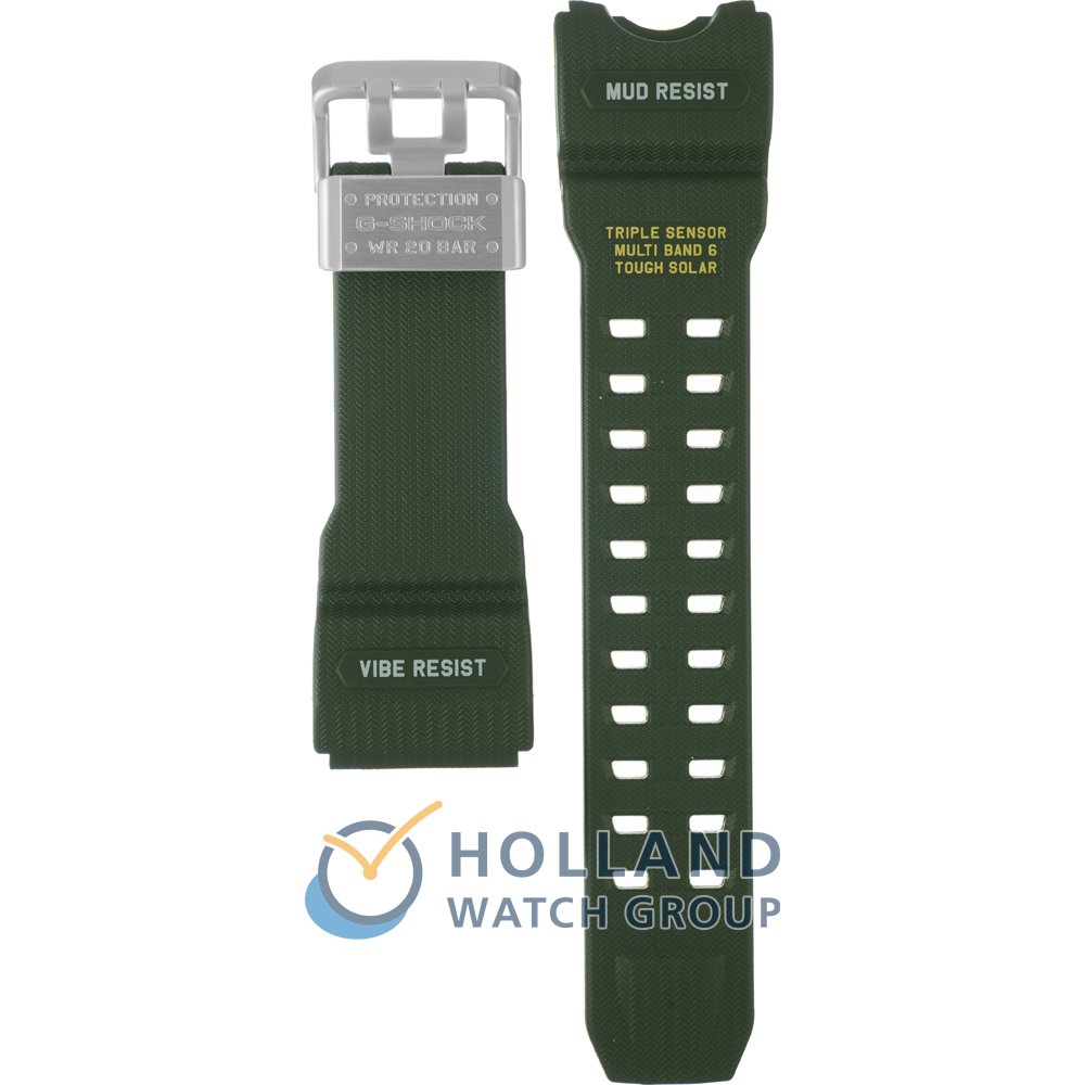 Dit G-Shock horlogebandje is gemaakt van kunststof en wordt aan het horloge bevestigd door middel van schroef. De band heeft een breedte van 28 mm en wordt gesloten door middel van een gesp. De band heeft geen rechte aanzet wat betekent dat deze band alleen geschikt is voor de horloges die hieronder worden vermeld.