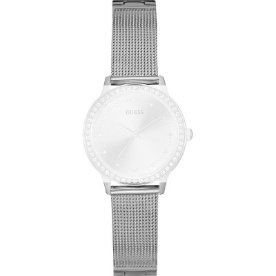 Dit Guess horlogebandje is gemaakt van roestvrij staal en wordt aan het horloge bevestigd door middel van bandpennen. De band heeft een breedte van 14 mm en wordt gesloten door middel van een milanese sluiting. De band heeft geen rechte aanzet wat betekent dat deze band alleen geschikt is voor de horloges die hieronder worden vermeld.