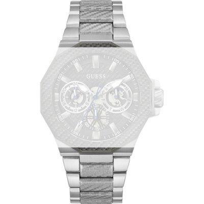 Dit Guess horlogebandje is gemaakt van roestvrij staal en wordt aan het horloge bevestigd door middel van stalen pennen. De band heeft een breedte van 27 mm en wordt gesloten door middel van een vouwsluiting met drukknoppen. De band heeft geen rechte aanzet wat betekent dat deze band alleen geschikt is voor de horloges die hieronder worden vermeld.