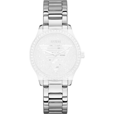 Dit Guess horlogebandje is gemaakt van roestvrij staal en wordt aan het horloge bevestigd door middel van bandpennen. De band heeft een breedte van 18 mm en wordt gesloten door middel van een vouwsluiting met drukknoppen. De band heeft geen rechte aanzet wat betekent dat deze band alleen geschikt is voor de horloges die hieronder worden vermeld.
