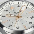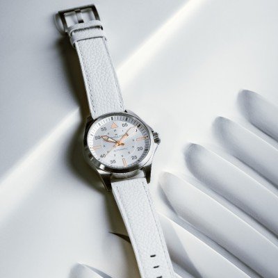 De Khaki Aviation Pilot Auto is het schoolvoorbeeld van een klassiek pilotenhorloge en een waardevolle toevoeging aan de Khaki collectie. Het horloge heeft een relatief dunne lunette op een kast van 36 mm die voldoende ruimte laat voor de helder vormgegeven wijzerplaat. De zwaardvormige geskeletterde uurwijzer onthult het uur op een slimme manier in de middelste ring van de wijzerplaat, terwijl de minutenwijzer met lumenpunt naar de buitenste ring met vergrote cijfers wijst. Een lichtgevende driehoek op 12 uur en lichtgevende indexen op 3, 6 en 9 uur voegen een retro aviator stijl toe aan de zeer leesbare wijzerplaat. Aangedreven door het H-10 automatische uurwerk met een gangreserve van 80 uur en Nivachron™ balansveer, is dit horloge zo cool en doordacht dat het zowel mannen als vrouwen zal aanspreken die houden van de tijdloze militaire kaki stijl.
