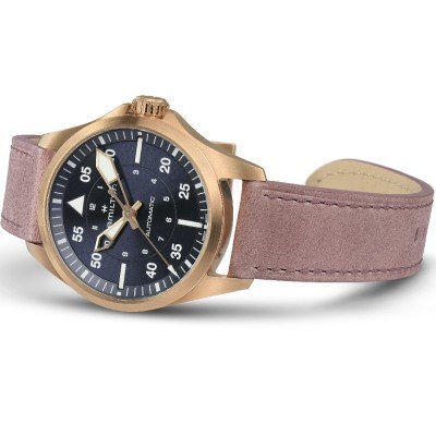 De Khaki Aviation Pilot Auto is het schoolvoorbeeld van een klassiek pilotenhorloge en een waardevolle toevoeging aan de Khaki collectie. Het horloge heeft een relatief dunne lunette op een kast van 36 mm die voldoende ruimte laat voor de helder vormgegeven wijzerplaat. De zwaardvormige geskeletterde uurwijzer onthult het uur op een slimme manier in de middelste ring van de wijzerplaat, terwijl de minutenwijzer met lumenpunt naar de buitenste ring met vergrote cijfers wijst. Een lichtgevende driehoek op 12 uur en lichtgevende indexen op 3, 6 en 9 uur voegen een retro aviator stijl toe aan de zeer leesbare wijzerplaat. Aangedreven door het H-10 automatische uurwerk met een gangreserve van 80 uur en Nivachron™ balansveer, is dit horloge zo cool en doordacht dat het zowel mannen als vrouwen zal aanspreken die houden van de tijdloze militaire kaki stijl.