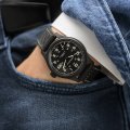 De klassieke, ingetogen fieldwatch-look voelt zich zowel thuis in de buitenlucht als in de kantoortuin. Met zijn matzwarte PVD-coating heeft het horloge de uitstraling van een stuk militaire stealth-uitrusting en een opmerkelijke afwerking.