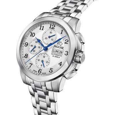 Sinds de oprichting in 1938 heeft Jaguar zich gericht op Zwitserse precisie-uurwerken om de grootste betrouwbaarheid en accuratesse te bereiken. Deze J975 Acamar uit de 'Le Chronographe' serie is een automatisch horloge met een Zwitsers Valjoux 7750-3H104 uurwerk; een kaliber van bewezen kwaliteit en precisie. De chronograafcomplicatie meet de verstreken tijd in eenheden 1 seconde, gedurende 12 uur, 30 minuten en 60 seconden en de langgerekte minutenwijzer 'raakt' de minutenbaan voor een nauwkeurige tijdweergave. Een ontspiegeld saffierglas zorgt voor uitzonderlijke zichtbaarheid van de wijzerplaat en weerstand tegen krassen. Het is een mooi en betrouwbaar horloge dat liefhebbers van klassieke herenhorloges zeker zal aanspreken!