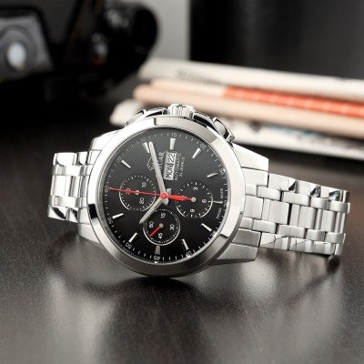 Sinds de oprichting in 1938 heeft Jaguar zich gericht op Zwitserse precisie-uurwerken om de grootste betrouwbaarheid en accuratesse te bereiken. Deze J975 Acamar uit de 'Le Chronographe' serie is een automatisch horloge met een Zwitsers Valjoux 7750-3H104 uurwerk; een kaliber van bewezen kwaliteit en precisie. De chronograafcomplicatie meet de verstreken tijd in eenheden 1 seconde, gedurende 12 uur, 30 minuten en 60 seconden en de langgerekte minutenwijzer 'raakt' de minutenbaan voor een nauwkeurige tijdweergave. Een ontspiegeld saffierglas zorgt voor uitzonderlijke zichtbaarheid van de wijzerplaat en weerstand tegen krassen. Het is een mooi en betrouwbaar horloge dat liefhebbers van klassieke herenhorloges zeker zal aanspreken!