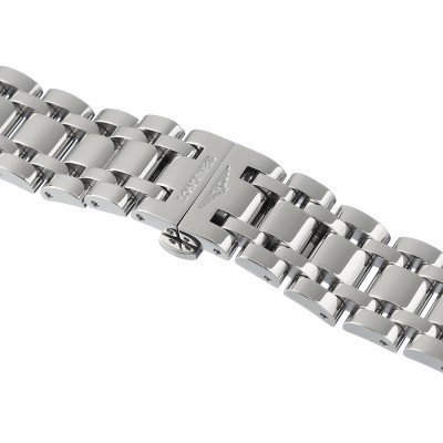 Dit Longines horlogebandje is gemaakt van roestvrij staal en wordt aan het horloge bevestigd door middel van bandpennen. De band heeft een breedte van 17 mm en wordt gesloten door middel van een vlindersluiting met drukknoppen. De band heeft geen rechte aanzet wat betekent dat deze band alleen geschikt is voor de horloges die hieronder worden vermeld.