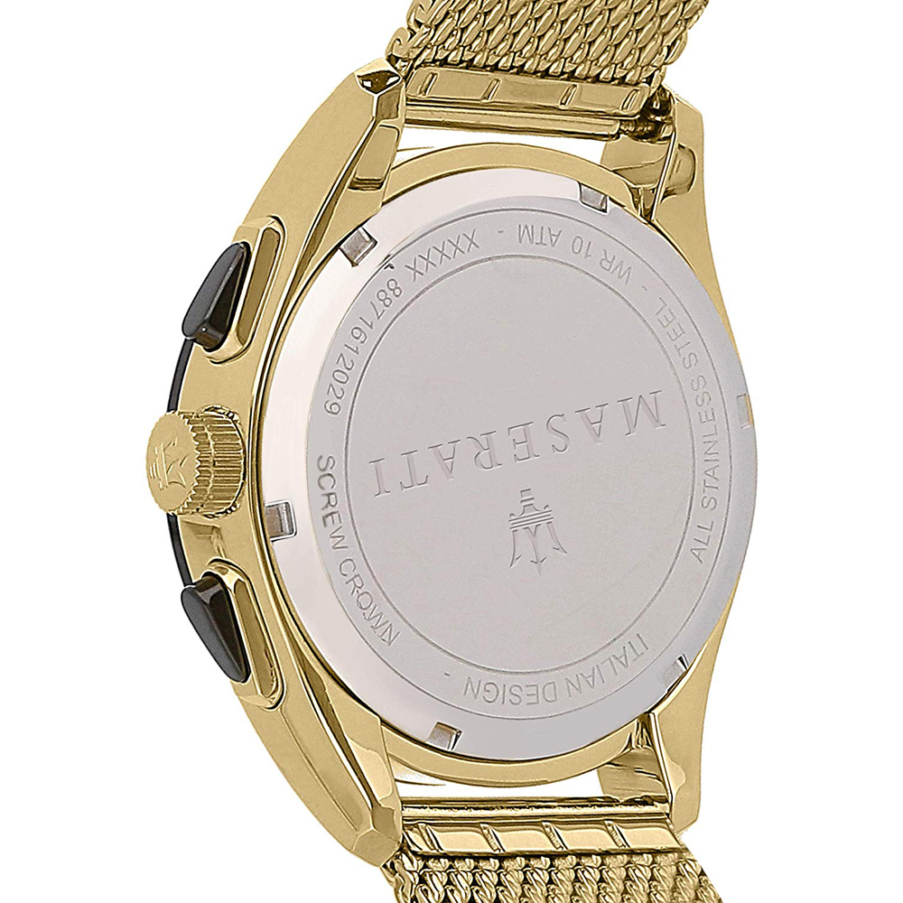Dit Maserati horloge heeft een goud gecoate roestvrijstalen kast met een diameter van 45mm en is voorzien van een metalen band. In de kast bevindt zich een quartz chronograaf kwaliteitsuurwerk en is afgewerkt met mineraalglas.
