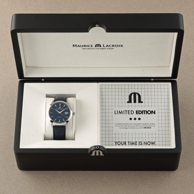 Het Automatic Vagues du Jura-horloge maakt deel uit van de 1975-collectie van Maurice Lacroix, die zijn 75e verjaardag viert. Het is een Limited Edition van 888 stuks die verwijst naar de thuisbasis van het bedrijf in de Franches-Montagnes en de fabriek in Saignelégier. De wijzerplaat is een eerbetoon aan de plaats van herkomst met het 'Vagues du Jura' motief van de wijzerplaat. Dit patroon, dat voor het eerst werd gebruikt op een Masterpiece-model, toont de glooiende heuvels die de omgeving van de Manufacture domineren. De kleur Saignelégier Blue, uniek voor Maurice Lacroix, is een verwijzing naar de geschiedenis van het merk. Op 3 uur wordt de datum weergegeven met een combinatie van witte cijfers op een blauwe schijf die matcht met de hoofdkleur van de wijzerplaat. Het horloge wordt aangedreven door een automatisch ML155 kaliber met een gangreserve van 56 uur, dat zichtbaar is door de gegraveerde achterzijde van de kast met saffierglas. Dit uurwerk is dunner dan in het standaard 1975 model, wat bijdraagt aan de dikte van het horloge van slechts 9 mm. Het uurwerk is verder verfijnd met perlage, colimaçon en een oscillerende massa die ook is versierd met de Vagues du Jura; details die dit model bijzonder maken. De 1975 Automatic wordt gedragen op een bijpassende Saignelégier Blue leren band met het Maurice Lacroix Easy Strap Exchange systeem.