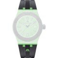 Dit Maurice Lacroix horlogebandje is gemaakt van rubber en wordt aan het horloge bevestigd door middel van quick release pushpins. De band heeft een breedte van 25 mm en wordt gesloten door middel van een gesp. De band heeft geen rechte aanzet wat betekent dat deze band alleen geschikt is voor de horloges die hieronder worden vermeld.