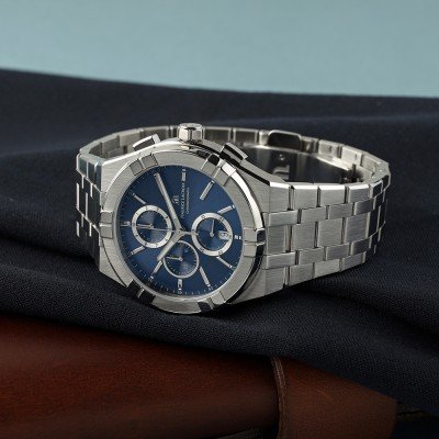 Het combineren van het klassieke Aikon uiterlijk met een chronograaf en een datum met behoud van een strakke en moderne uitstraling is een prestatie waar Maurice Lacroix trots op kan zijn. De wijzerplaten van de chronograaf zijn perfect gepositioneerd in een lijnenspel met de uur- en minutenindexen, terwijl het datumvenster zijn plaats opeist op 6 uur. De chronograafdrukkers zijn subtiel geïntegreerd in de horlogekast en staan op één lijn met de Aikon 'klauwen' op 2 en 4 uur. Het horloge wordt aangedreven door een Ronda 3540.D quartz uurwerk dat een grote nauwkeurigheid biedt, waardoor de Aikon quartz chronograaf niet alleen een instrument voor tijdwaarneming is, maar ook een mooi en praktisch horloge voor elke dag.