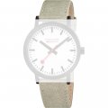 Dit Mondaine horlogebandje is gemaakt van met textiel overtrokken leer en wordt aan het horloge bevestigd door middel van bandpennen. De band heeft een breedte van 20 mm en wordt gesloten door middel van een gesp. De band heeft een rechte aanzet wat betekent dat deze band geschikt is voor alle Mondaine horloges met een rechte aanzet.