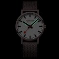 Dit Mondaine horloge heeft een kast gemaakt van Roestvrijstaal met een diameter van 40 mm en is voorzien van een Roestvrijstaal band. In de kast bevindt zich een Ronda kwaliteitsuurwerk en is afgewerkt met Gehard mineraalglasglas.