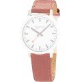 Dit Mondaine horlogebandje is gemaakt van textiel en wordt aan het horloge bevestigd door middel van quick release pushpins. De band heeft een breedte van 20 mm en wordt gesloten door middel van een gesp. De band heeft een rechte aanzet wat betekent dat deze band geschikt is voor alle Mondaine horloges met een rechte aanzet.