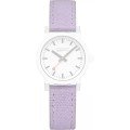 Dit Mondaine horlogebandje is gemaakt van textiel en wordt aan het horloge bevestigd door middel van quick release pushpins. De band heeft een breedte van 16 mm. De band heeft een rechte aanzet wat betekent dat deze band geschikt is voor alle Mondaine horloges met een rechte aanzet.