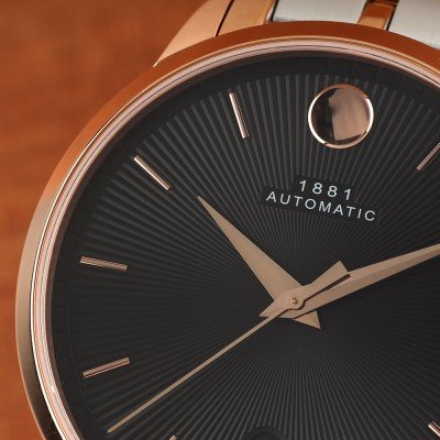 De Movado 1881 Automatic horloges combineren de bekende Movado designelementen met een luxe uitstraling. Onder de sunray gegraveerde wijzerplaat ligt een Zwitsers ETA 2824-2 uurwerk. Het heeft Incabloc schokbescherming, een quick-set datummechanisme en een gangreserve van ongeveer 40 uur. Het uurwerk is ook prachtig afgewerkt; dankzij de doorzichtige achterkant van de kast kunt u de prachtige Movado rotor bewonderen. De opvallende grote holle punt op 12 staat voor de zon, die op zijn sterkst is op het middaguur en is Movado's kenmerkende designelement. De minuten- en uurwijzers zijn zelf kleine kunstwerkjes. Het zijn scherp facetgeslepen Dauphine wijzers die Movado's aandacht voor detail benadrukken. Iets wat duidelijk te zien is in dit prachtige horloge.