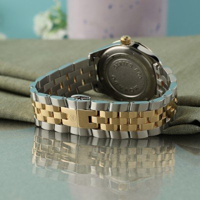 Dit prachtige klassieke bicolor Movado dameshorloge heeft 10 echte diamanten indexen en een glanzende geribbelde lunette.