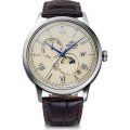 Dit Orient horloge heeft een kast gemaakt van Roestvrijstaal met een diameter van 41.5 mm en is voorzien van een leren band. In de kast bevindt zich een Epson kwaliteitsuurwerk en is afgewerkt met Mineraalglas.