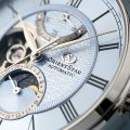 Dit M45 F7 horloge is gelimiteerd tot 190 stuks en heeft een ontwerp dat gebaseerd is op de Mechanical Moon Phase die in 2017 werd uitgebracht. De maanfase is aanzienlijk veranderd ten opzichte van het origineel, waarbij de achtergrond nu een diepblauwe nachtelijke hemel is, waardoor de sterren helderder en duidelijker lijken. De prachtig gedetailleerde wijzerplaat is voorzien van een patroon dat is samengesteld uit het Orient Star-logo dat alleen zichtbaar is afhankelijk van de lichtinval. Met alle belangrijke functies geconcentreerd in het midden van de gelaagde wijzerplaat, springt de buitenste ring met Romeinse cijfers er echt uit. De ontspiegelende coating aan beide zijden van het saffierglas blokkeert bijna negenennegentig procent van de reflecties, waardoor het vanuit elke hoek goed leesbaar is.