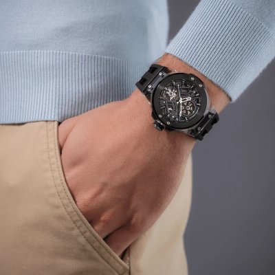 Dit Police horloge heeft een kast gemaakt van Kunsthars met een diameter van 44 mm en is voorzien van een Rubber band. In de kast bevindt zich een CN kwaliteitsuurwerk en is afgewerkt met Mineraalglas.