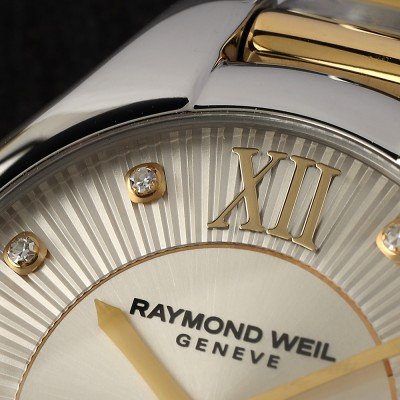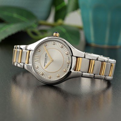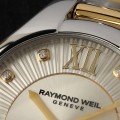 Het Raymond Weil Noemia dameshorloge is vernoemd naar de kleindochter van de oprichter. Het horloge weerspiegelt de moderne vrouw: delicaat en vrouwelijk, maar toch volwassen en zelfverzekerd. Het Noemia horloge is verkrijgbaar in verschillende ontwerpen en kleurstellingen, die allemaal één ding gemeen hebben: het zijn zeer stijlvolle dameshorloges. Dit Noemia-horloge heeft 11 echte diamanten op de sunray wijzerplaat.