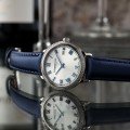 De Raymond Weil Toccata-horlogeserie wortelt diep in de artistieke en muzikale achtergrond van het merk. Dit elegante en luxe dameshorloge heeft een slanke, 29 mm roestvrijstalen kast versierd met 76 diamanten (0,174 ct). De zilvergelakte en sunray gesatineerde wijzerplaat is bezet met opgelegde Romeinse cijferindexen en heeft een ‘spoorweg’ cijferring die de minuten nauwkeurig aangeeft. De comfortabele leren band heeft een toplaag van verfijnd blauw satijn.