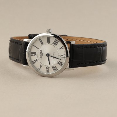 Dit Roamer horloge heeft een kast gemaakt van Roestvrijstaal met een diameter van 28 mm en is voorzien van een leren band. In de kast bevindt zich een Ronda kwaliteitsuurwerk en is afgewerkt met Saffierglas.