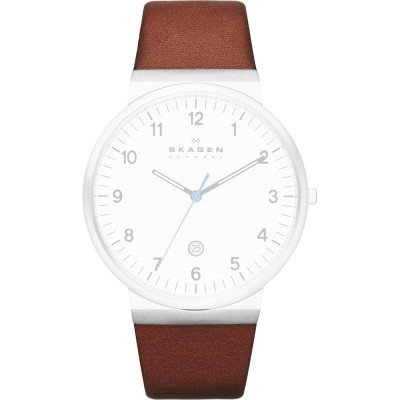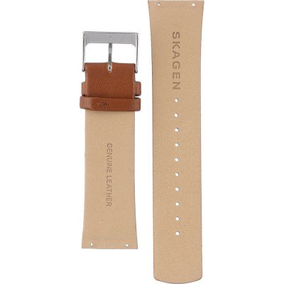 Dit Skagen horlogebandje is gemaakt van leer en wordt aan het horloge bevestigd door middel van schroeven. De band heeft een breedte van 22 mm en wordt gesloten door middel van een gesp. De band heeft geen rechte aanzet wat betekent dat deze band alleen geschikt is voor de horloges die hieronder worden vermeld.