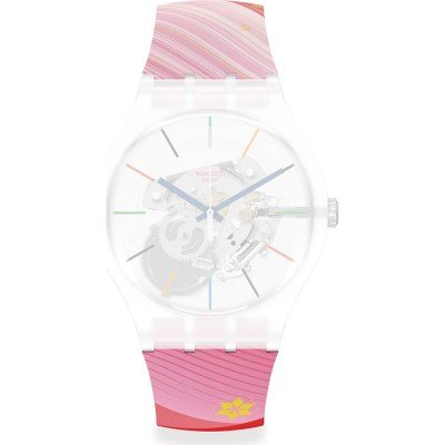 Dit Swatch horlogebandje is gemaakt van siliconen en wordt aan het horloge bevestigd door middel van stalen pennen. De band heeft een breedte van 19.7 mm en wordt gesloten door middel van een gesp. De band heeft geen rechte aanzet wat betekent dat deze band alleen geschikt is voor de horloges die hieronder worden vermeld.